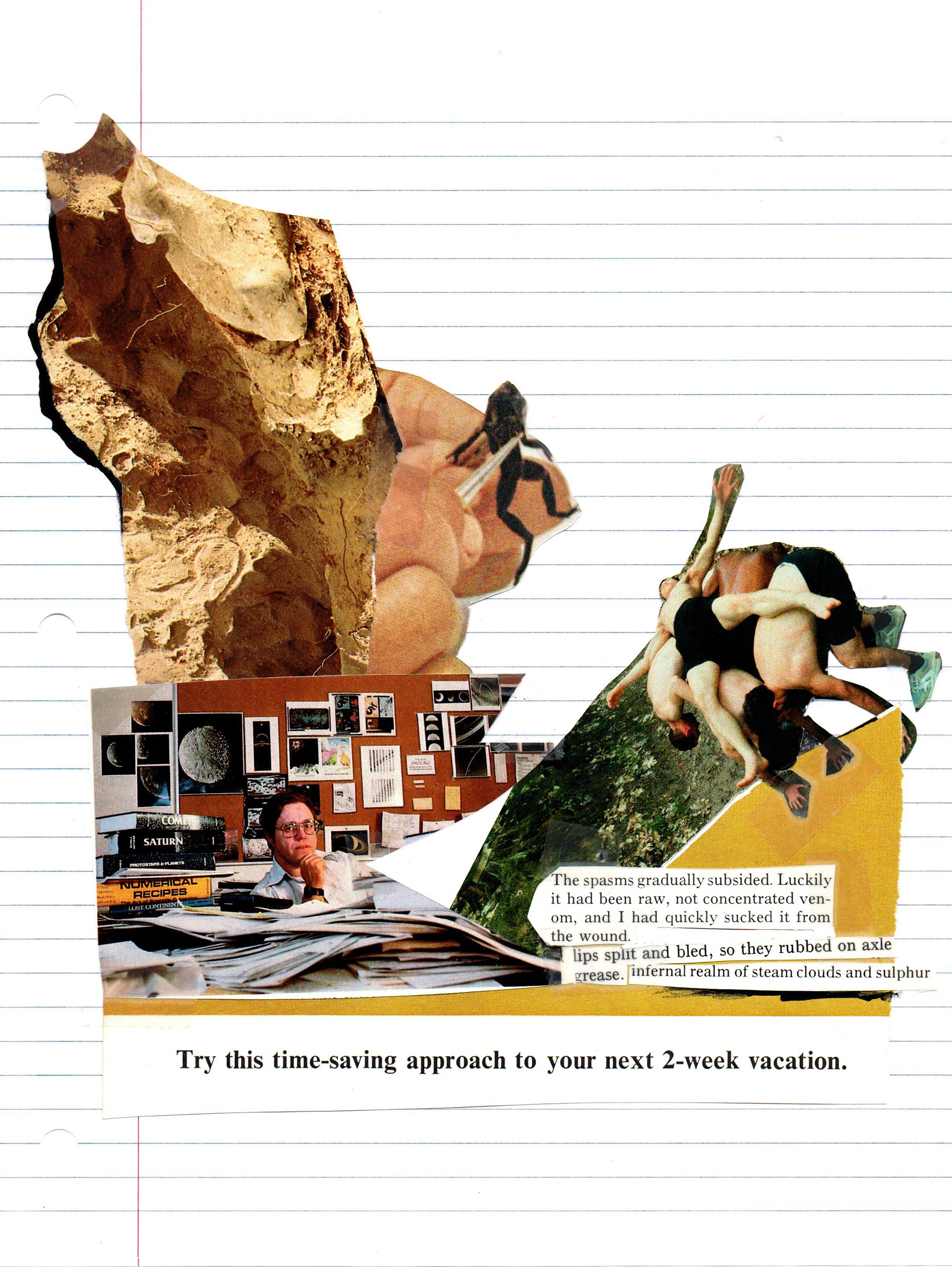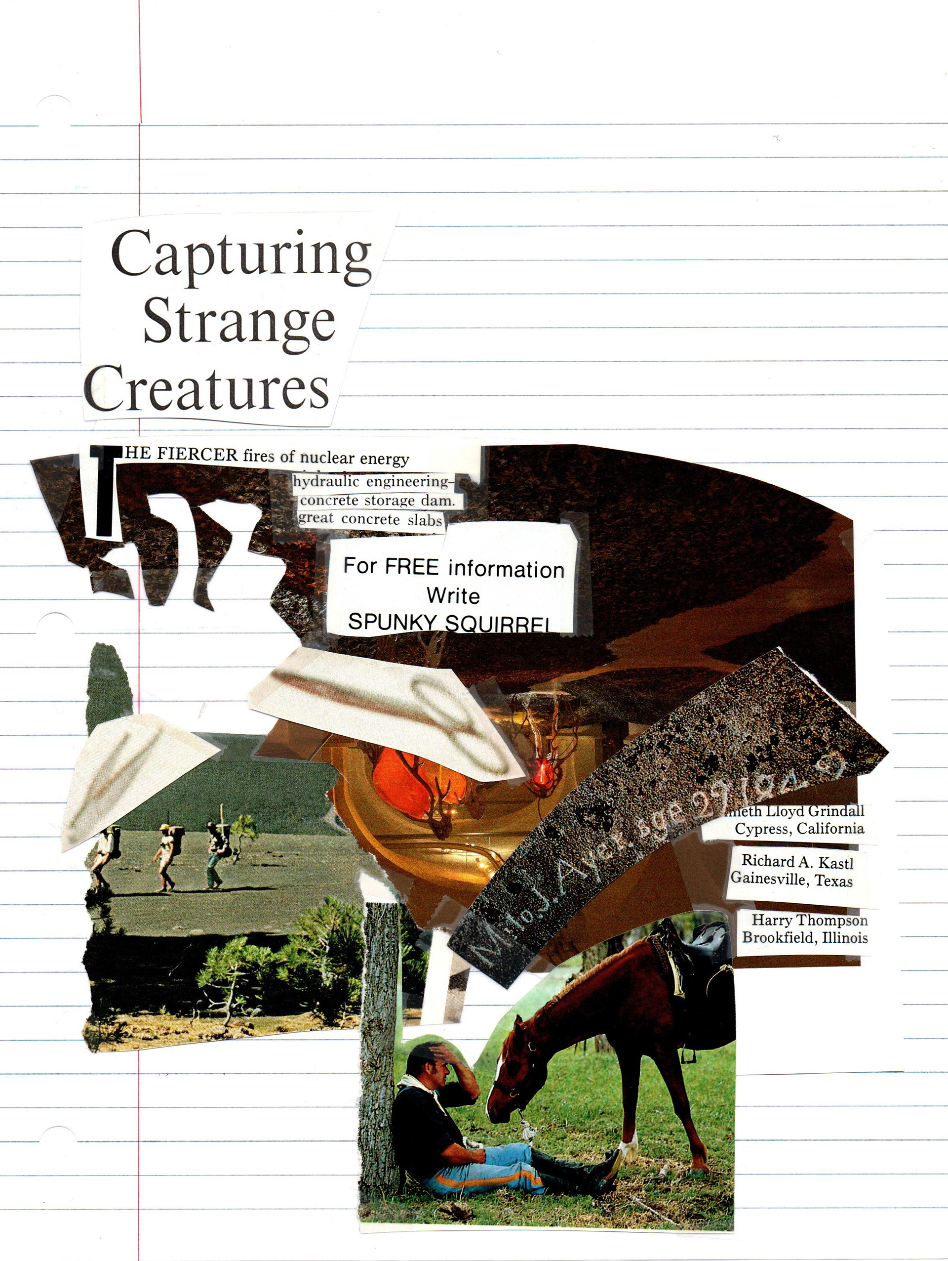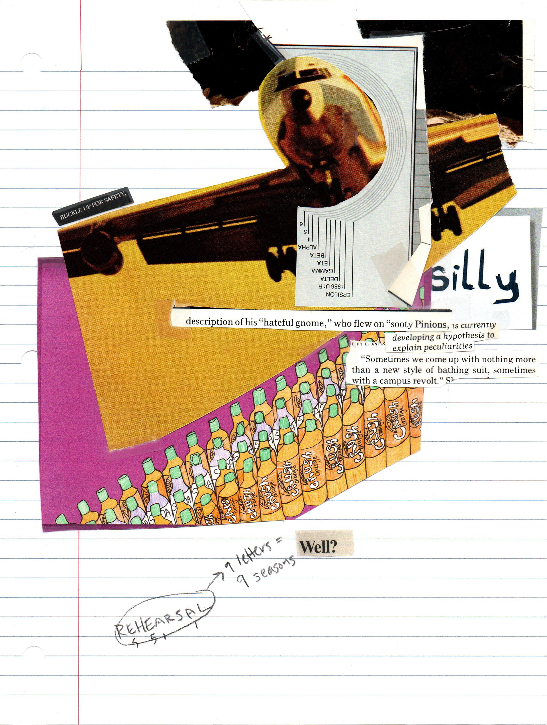 Magazine images, graphite, and Scotch tape on lined paper. Under 8.5x11in